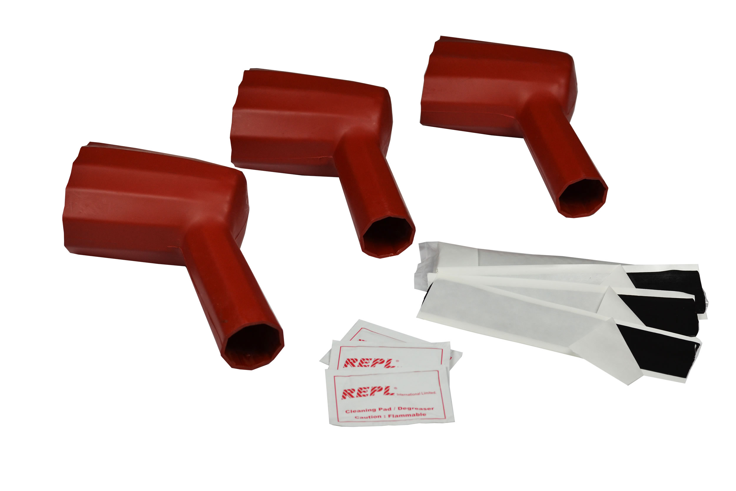 A range of heat shrink right angled insulating boot kits that are used when clearances are insufficient between phase to phase conductors connected to cable boxes and switchgear to prevent flash over.