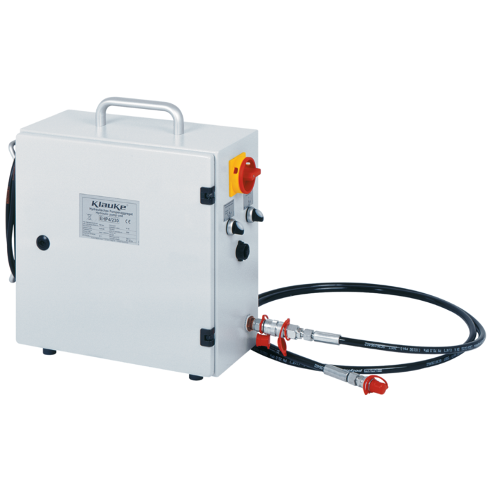 Klauke Electro hydraulic pump complete with quick release coupler for connection to crimping and cutting heads. Suitable for high capacity and the larger crimping and cutting performed on site.